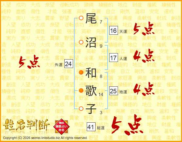 尾(7画)沼(9画) 和(8画)歌(14画)子(3画)