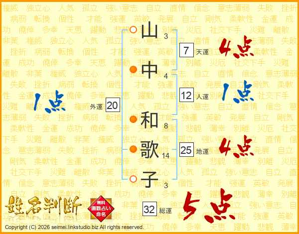 山(3画)中(4画) 和(8画)歌(14画)子(3画)