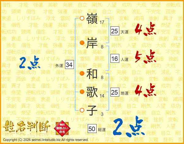 嶺(17画)岸(8画) 和(8画)歌(14画)子(3画)