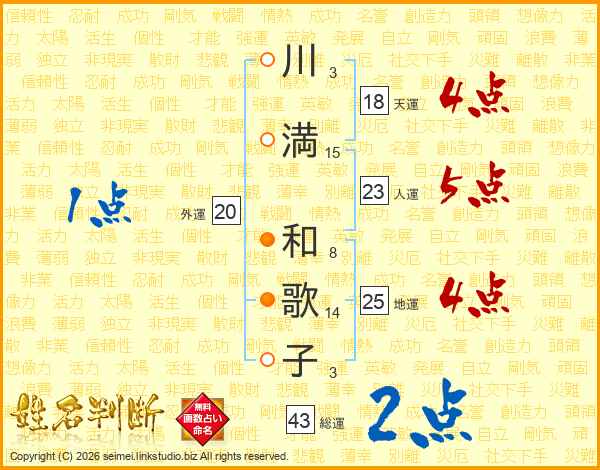川(3画)満(15画) 和(8画)歌(14画)子(3画)