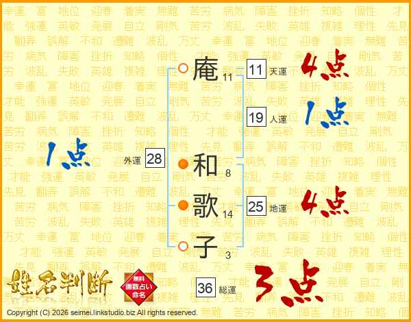 庵(11画) 和(8画)歌(14画)子(3画)