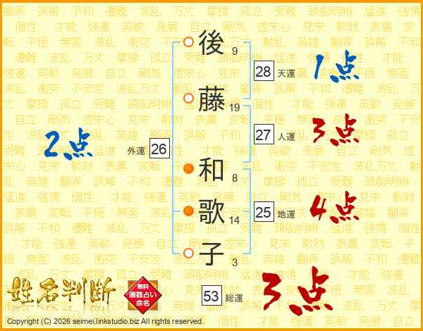 後(9画)藤(19画) 和(8画)歌(14画)子(3画)