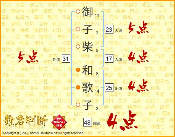 御(11画)子(3画)柴(9画) 和(8画)歌(14画)子(3画)