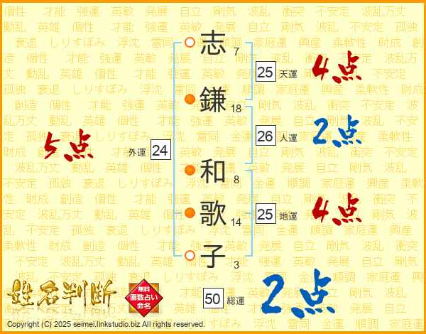 志(7画)鎌(18画) 和(8画)歌(14画)子(3画)