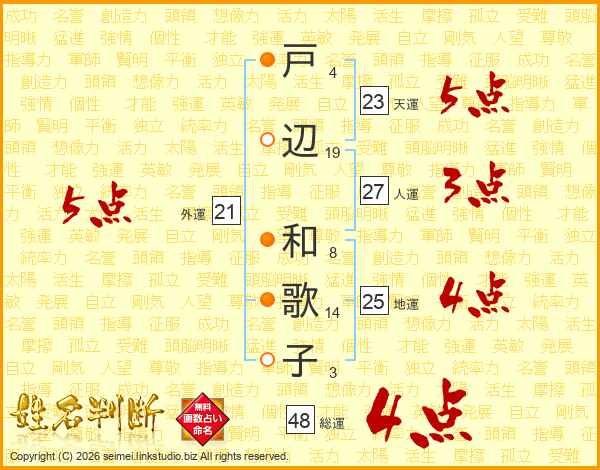 戸(4画)辺(19画) 和(8画)歌(14画)子(3画)