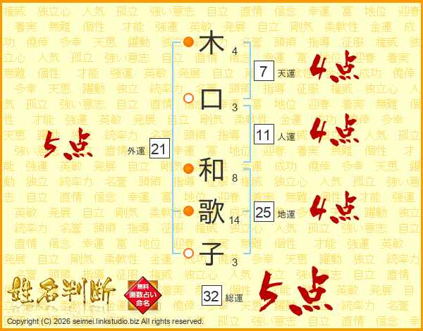 木(4画)口(3画) 和(8画)歌(14画)子(3画)