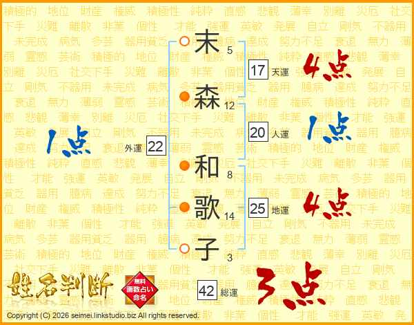 末(5画)森(12画) 和(8画)歌(14画)子(3画)