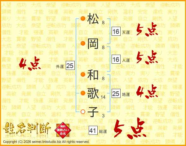 松(8画)岡(8画) 和(8画)歌(14画)子(3画)