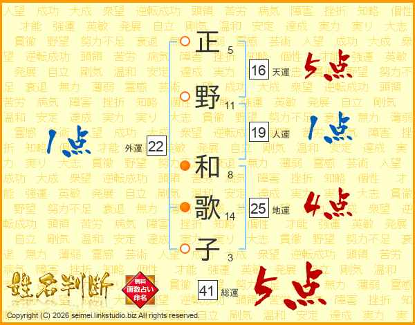 正(5画)野(11画) 和(8画)歌(14画)子(3画)