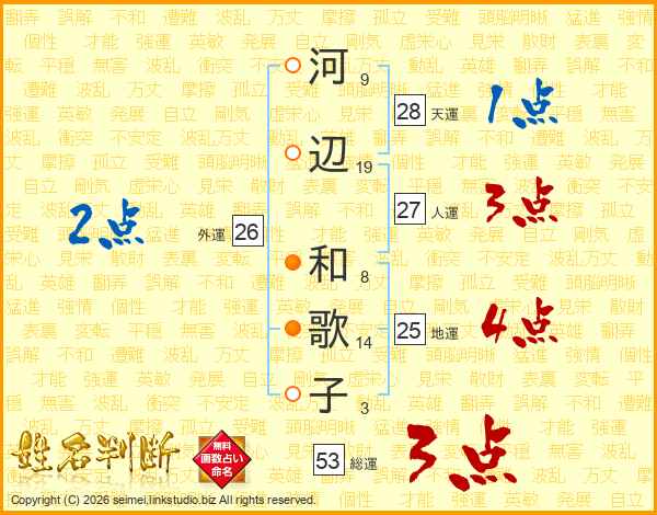 河(9画)辺(19画) 和(8画)歌(14画)子(3画)