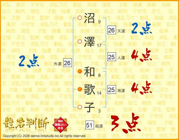 沼澤和歌子さんの天運は26画の2点!