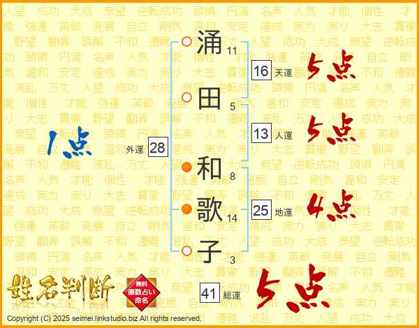 涌(11画)田(5画) 和(8画)歌(14画)子(3画)