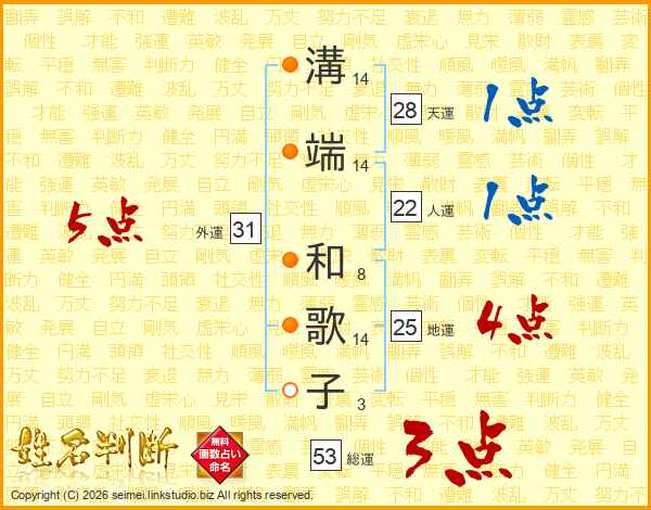 生活面を象徴する運勢です。外部から受ける影響力を表し、結婚運、家庭運や職場、環境への順応性を表します。総運から人運を引いた画数。姓や名が1文字の場合を除く。