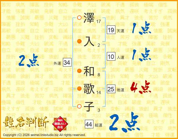 澤(17画)入(2画) 和(8画)歌(14画)子(3画)