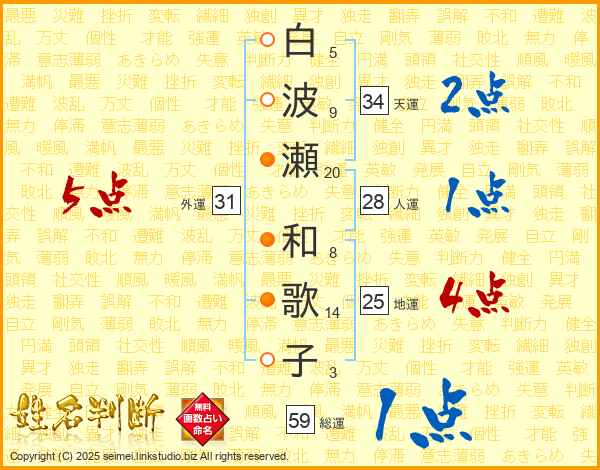 白(5画)波(9画)瀬(20画) 和(8画)歌(14画)子(3画)