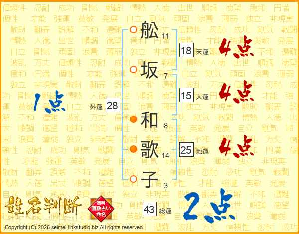 舩(11画)坂(7画) 和(8画)歌(14画)子(3画)