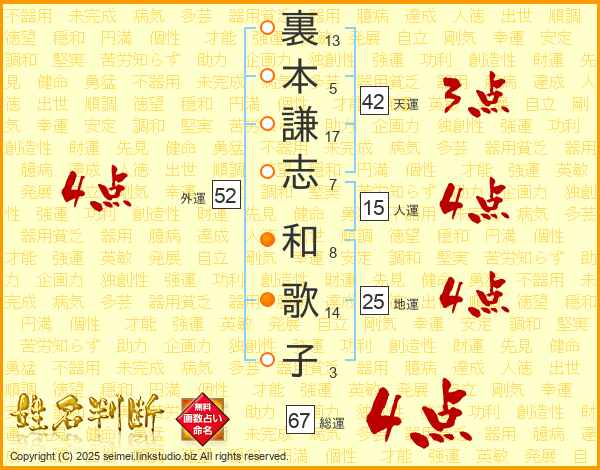 裏(13画)本(5画)謙(17画)志(7画) 和(8画)歌(14画)子(3画)