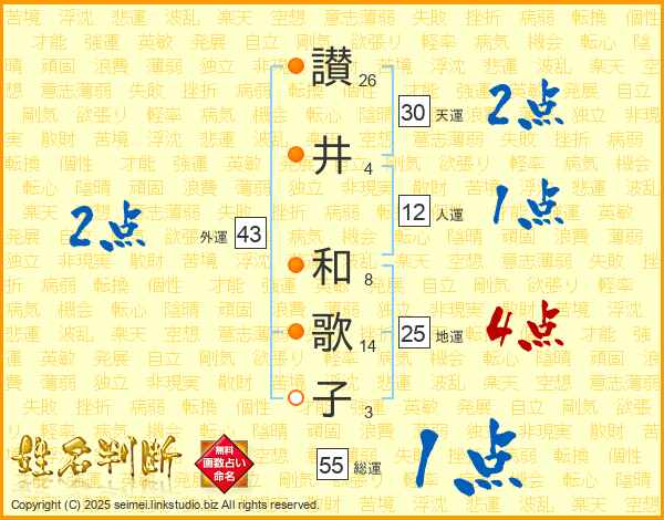 讃(26画)井(4画) 和(8画)歌(14画)子(3画)