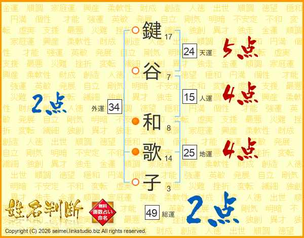 鍵(17画)谷(7画) 和(8画)歌(14画)子(3画)