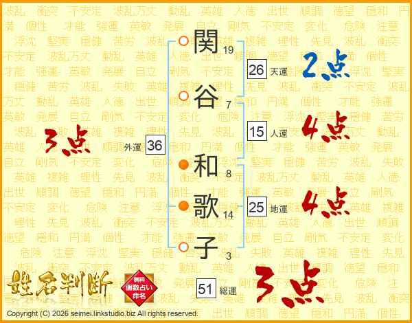 関(19画)谷(7画) 和(8画)歌(14画)子(3画)