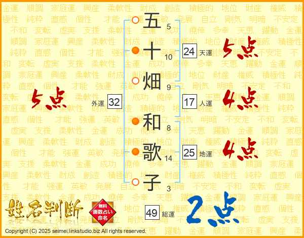 五(5画)十(10画)畑(9画) 和(8画)歌(14画)子(3画)