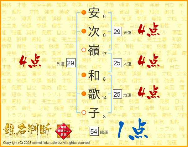 安(6画)次(6画)嶺(17画)  和(8画)歌(14画)子(3画)