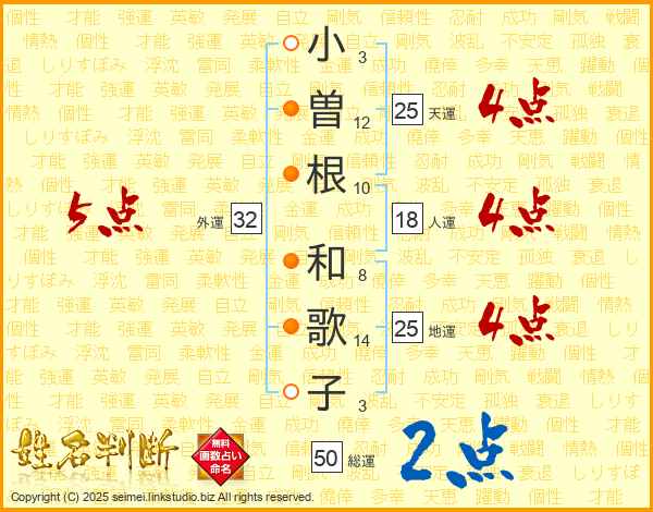 小(3画)曽(12画)根(10画) 和(8画)歌(14画)子(3画)