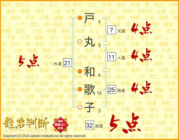 戸(4画)丸(3画)  和(8画)歌(14画)子(3画)