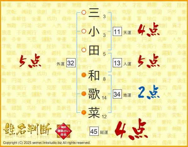 三(3画)小(3画)田(5画) 和(8画)歌(14画)菜(12画)