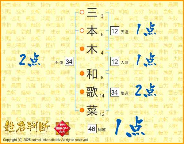 三(3画)本(5画)木(4画) 和(8画)歌(14画)菜(12画)
