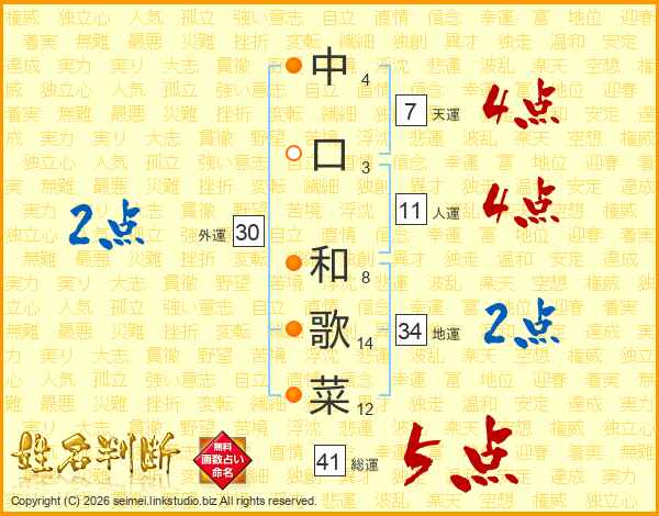 あなたの人生を表す1番重要な運勢です。生涯を通じて影響する総合運となり、主に50歳以降の晩年期に影響を及ぼします。苗字と名前の合計画数。