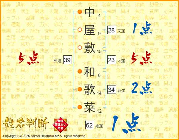 生活面を象徴する運勢です。外部から受ける影響力を表し、結婚運、家庭運や職場、環境への順応性を表します。総運から人運を引いた画数。姓や名が1文字の場合を除く。