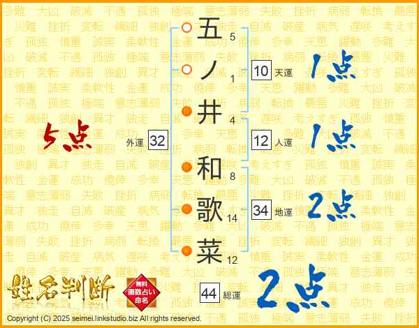 五(5画)ノ(1画)井(4画) 和(8画)歌(14画)菜(12画)