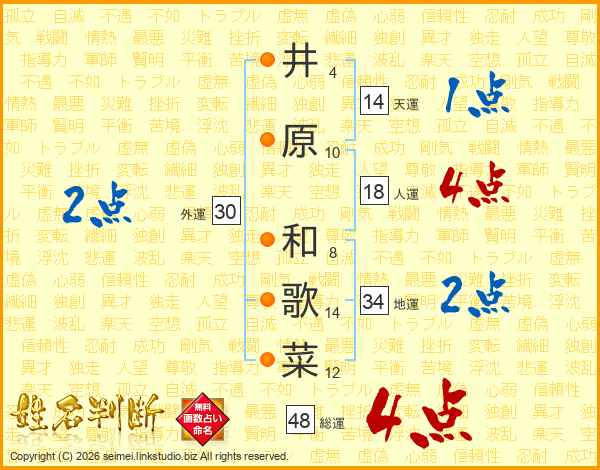 井(4画)原(10画) 和(8画)歌(14画)菜(12画)