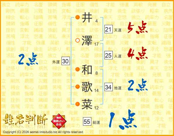 井(4画)澤(17画) 和(8画)歌(14画)菜(12画)