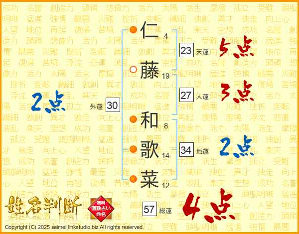 仁(4画)藤(19画) 和(8画)歌(14画)菜(12画)