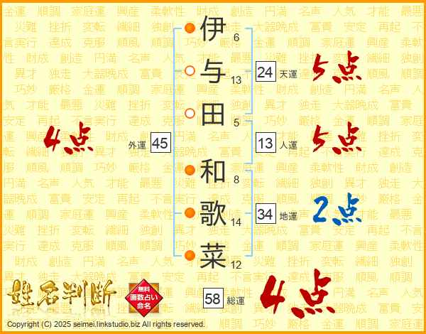伊(6画)与(13画)田(5画) 和(8画)歌(14画)菜(12画)