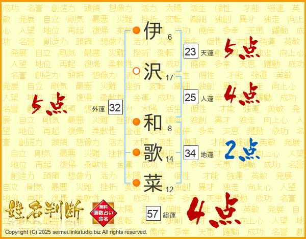 伊(6画)沢(17画) 和(8画)歌(14画)菜(12画)