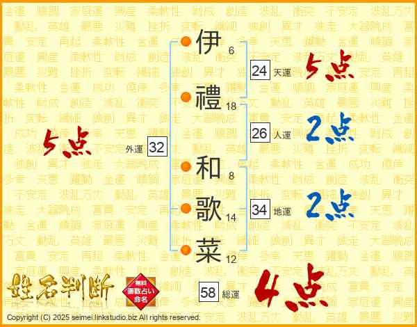 伊(6画)禮(18画) 和(8画)歌(14画)菜(12画)