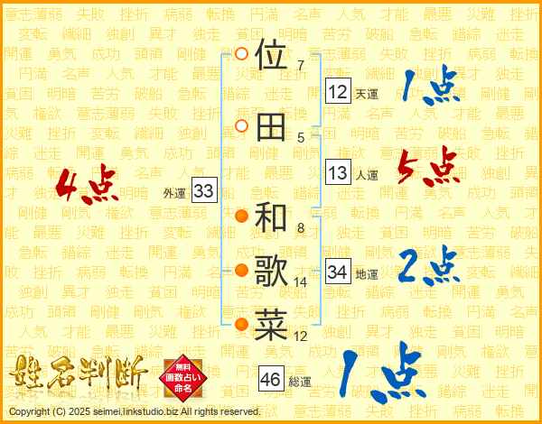 位(7画)田(5画) 和(8画)歌(14画)菜(12画)