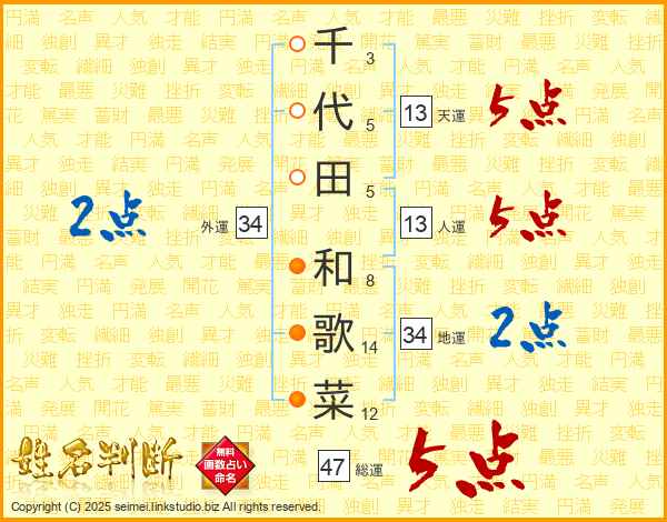 千(3画)代(5画)田(5画) 和(8画)歌(14画)菜(12画)