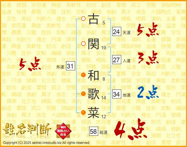 古(5画)関(19画) 和(8画)歌(14画)菜(12画)