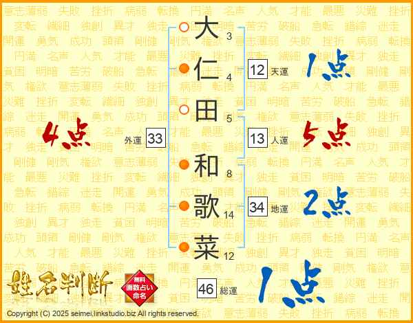 大(3画)仁(4画)田(5画) 和(8画)歌(14画)菜(12画)
