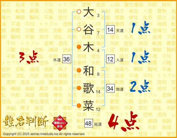 大(3画)谷(7画)木(4画) 和(8画)歌(14画)菜(12画)
