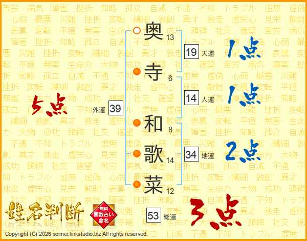 奥(13画)寺(6画) 和(8画)歌(14画)菜(12画)