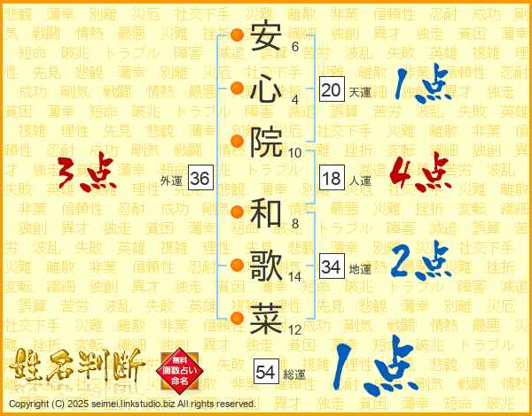 安(6画)心(4画)院(10画) 和(8画)歌(14画)菜(12画)