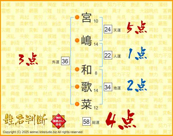 宮(10画)嶋(14画) 和(8画)歌(14画)菜(12画)