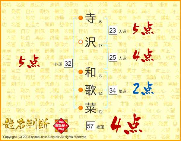 寺(6画)沢(17画) 和(8画)歌(14画)菜(12画)