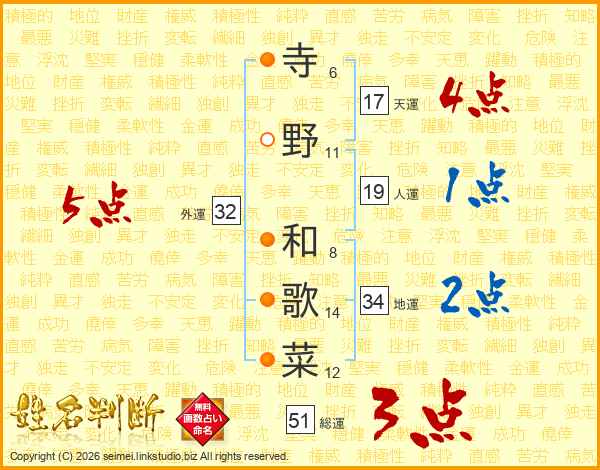 寺(6画)野(11画) 和(8画)歌(14画)菜(12画)