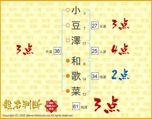 小(3画)豆(7画)澤(17画) 和(8画)歌(14画)菜(12画)